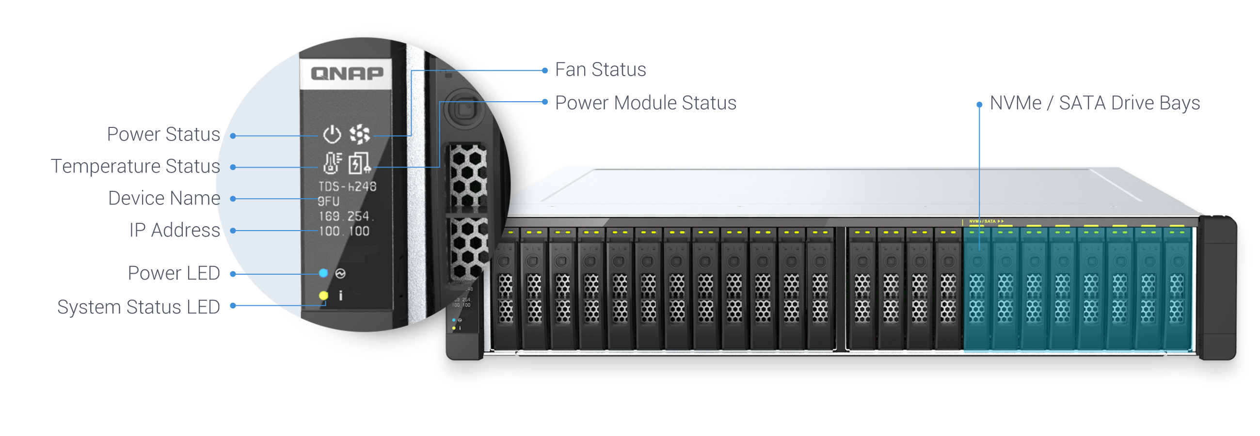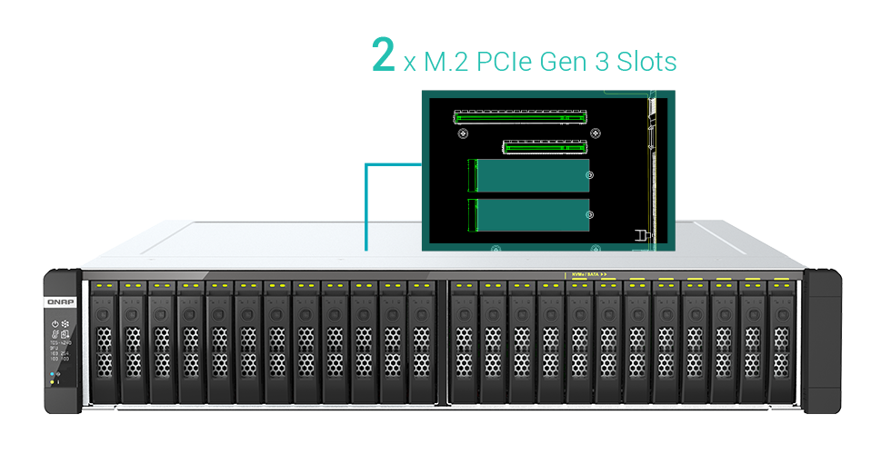 Чтобы добиться оптимальных показателей IOPS и минимизировать задержку, настройте кэширование с использованием 2,5-дюймовых SSD или двух SSD M.2 2280 (NVMe PCIe Gen 3 или SATA 6 Гбит/с, продаются отдельно). Используйте надежные твердотельные накопители для центров обработки данных (например, твердотельные накопители Intel® Optane™) для усиления защиты ZIL вместе с QuTS hero Dedicated ZIL - SLOG. Дополнительные слоты M.2 SSD можно получить при использовании карт расширения QM2 PCIe. В слоты M.2 PCIe также можно установить Coral M.2 Accelerator с Edge TPU, который обеспечивает доступное решение для быстрого распознавания изображений в приложениях NAS на основе искусственного интеллекта.