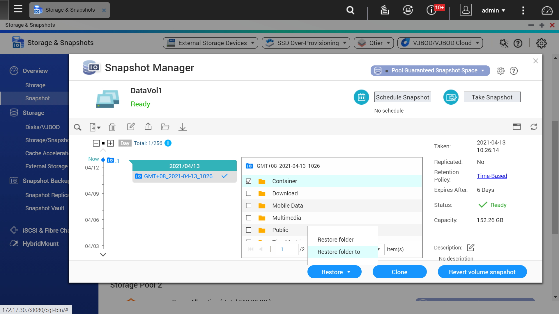 | Восстановление данных с помощью снимков | Содержимое моментальных снимков можно быстро восстановить в виде папок или файлов на вашем NAS, на удаленном NAS или в облачное хранилище. Также моментальные снимки могут быть восстановлены со стороны клиента. |
