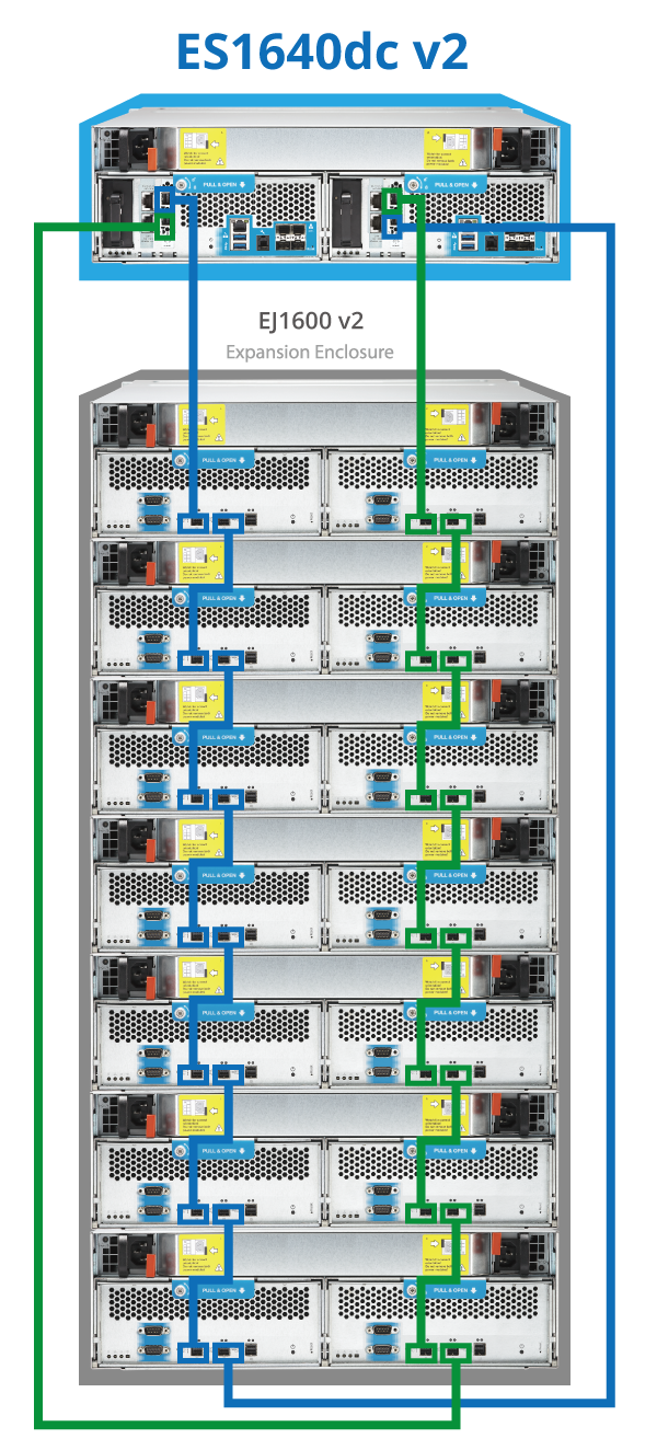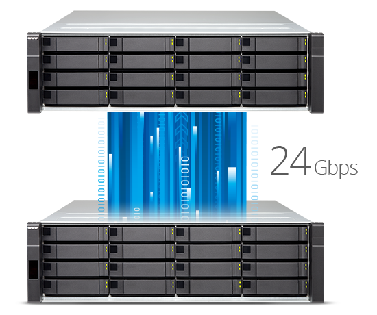 Можно легко и быстро увеличить дисковую емкость корпоративной СХД, подключив до 7 полок расширения через двойные высокоскоростные кабели mini-SAS. Благодаря интерфейсу SAS 12 Гбит/с модули EJ1600 обеспечивают скоростную передачу информации. Это особенно востребовано при использовании приложений виртуализации, работе с большими базами данных и обслуживании систем видеонаблюдения, телевещания и архивирования. Все полки подключаются к головному или вышестоящему устройству сразу двумя кабелями для беспрерывной работы в случае отключения одного из них.