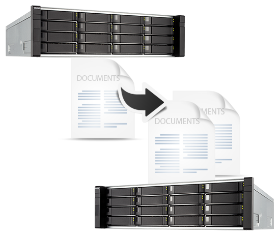 Помимо расширения имеющихся томов, администраторы ИТ могут использовать EJ1600 в качестве внешнего хранилища для быстрого и безопасного создания резервных копий данных, хранящихся в системе Turbo NAS. С помощью функции удаленной репликации в реальном времени QNAP RTRR (Real-Time Remote Replication) или службы rsync администраторы могут организовать резервное копирование данных Turbo NAS на модуль EJ1600 в режиме реального времени или по расписанию.