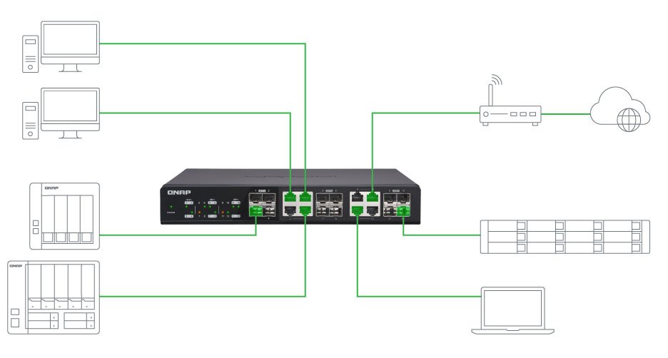 Для предприятий среднего и малого бизнеса, отделов по работе с графическим и видеоконтентом компания QNAP представляет неуправляемый коммутатор QSW-1208-8C. Коммутатор поставляется с комплектом креплений для монтажа в 19" стойку и резиновыми ножками для настольного размещения. Общая пропускная способность коммутатора составляет 240 Гбит/с, что позволяет использовать его на узлах, требующих высшей пропускной способностью. Коммутатор является неуправляемым, что позволяет пользователю самостоятельно установить коммутатор и наслаждаться небывалым приростом сетевой производительности.