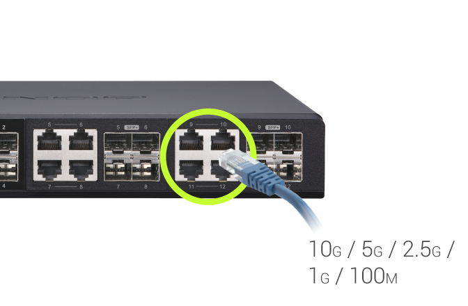 Коммутатор управляемый 10 Гбит/с с 12 портами SFP+, из которых 8 совмещены с RJ-45, пропускная способность до 240 Гбит/с, поддержка JumboFrame.