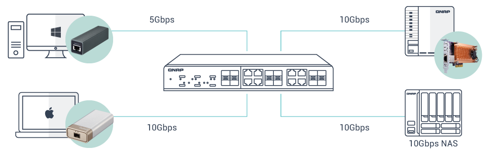 Многие современные сетевые накопители QNAP оснащены 10-гигабитными портами SFP+ и 10GBASE-T в базовой комплектации, а также поддерживают установку дополнительных сетевых адаптеров в слоты PCIe. Также QNAP предлагает адаптеры-переходники Thunderbolt 3–10GbE и USB 3.2 Gen 1–5GbE. Все эти устройства можно использовать вместе с QSW-M1208-8C для создания комплексной сетевой инфраструктуры 10G.
