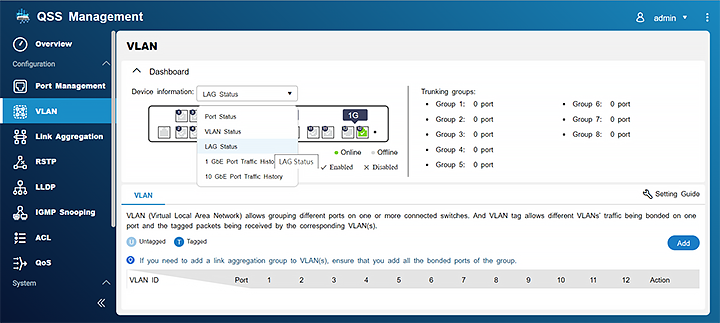 Link Aggregation (LAG) объединяет несколько сетевых подключений для увеличения пропускной способности и защиты от сбоев подключения.Виртуальные сети (VLAN) позволяют объединять группы устройств из разных сетей в единую сеть.QoS (качество обслуживания) помогает приоритизировать использование канала для оптимизации распределения сетевых ресурсов.Отслеживание IGMP помогает свести к минимуму потерю трафика предотвратить утечку сетевой информации.