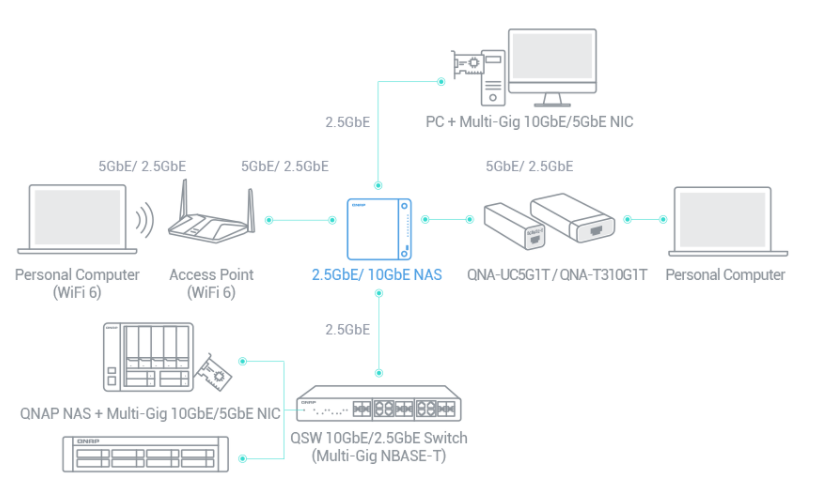 QNAP предлагает широкий спектр сетевых устройств, с помощью которых корпоративные и домашние пользователи могут построить инфраструктуру хранения и обмена данными через соединения на скорости 10 Гбит/с. Через адаптер-переходник от Thunderbolt 3 к 10GbE можно подключить компьютеры, ноутбуки и другие устройства без встроенных сетевых портов.