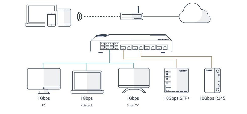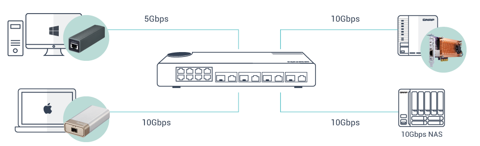 Множество современных моделей NAS QNAP оснащены портами 10GbE SFP + и 10GBASE-T в базовой комплектации, а так-же имеют возможность установки дополнительных сетевых адаптеров в слоты PCIe. Другие решения от QNAP оснащены адаптерами Thunderbolt 3–10GbE и сетевые адаптеры USB 3.2 Gen 1–5GbE. Все это можно использовать с QSW-M408-4C для создания комплексной высокоскоростной сетевой.