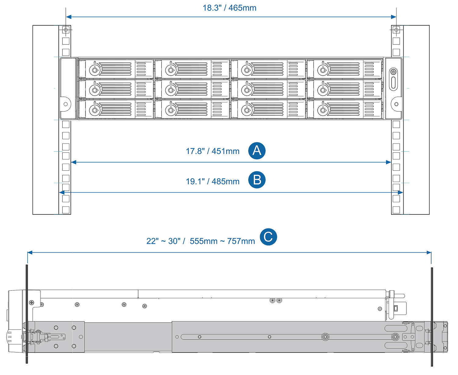 - C. Глубина монтажной стойки: 22" — 30" / 555 — 757 мм