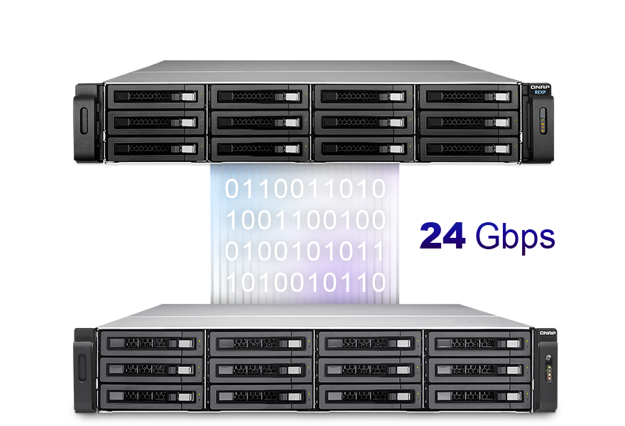 Модуль REXP-1210U-RP оснащен тремя портами SAS для подключения хостов и последовательного соединения соответственно. Каждый широкий порт SAS включает в себя четыре канала SAS, каждый из которых поддерживает скорость 6 Гбит/с в режиме дуплекса. Данное решение обеспечивает беспрецедентную производительность – до 24 Гбит/с на одно соединение с хостом.