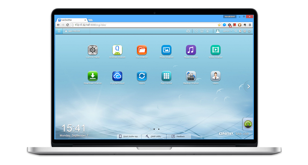 TAS-168 – это ваше частное облачное хранилище, которое фактически расширяет емкость ваших мобильных устройств. Qfile позволяет просматривать, загружать, скачивать, управлять и делиться хранимыми файлами так же легко, как если бы вы носили кучу файлов на своем мобильном устройстве. Вы можете организовать потоковую трансляцию, просмотр, прослушивание и общий доступ к музыкальным, фото- и видеофайлам в любое время и в любом месте. Qmanager позволяет эффективно отслеживать состояние хранилища TAS-168, а также управлять работой устройства в дистанционном режиме, даже не включая компьютер.