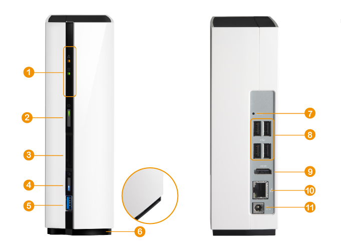 1. Индикаторы: статус, сеть, USB, HDD 1