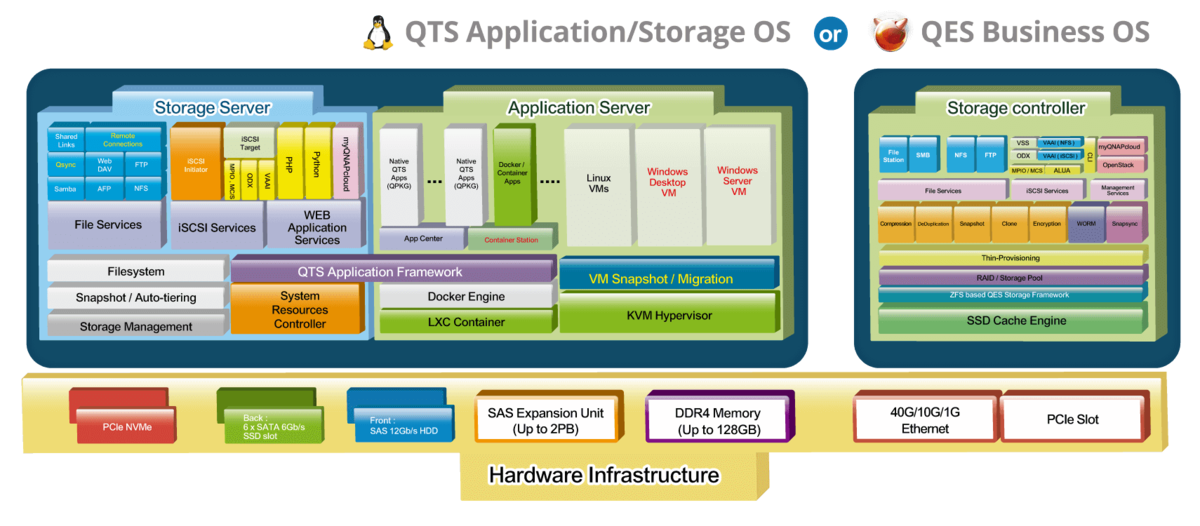 | Аппаратная платформа | Enterprise ZFS NAS ES серии NAS | QNAP Turbo NAS TS / TVS / TAS / TDS серии |