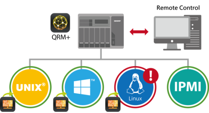 QRM+ - это система удаленного управления серверами разработанная специально для IT специалистов. Представляет собой решение доступное из любого браузера, которое позволяет находить сервера в сети, наносить их на карту топологии, следить за состоянием всех важных узлов сети и осуществлять централизованное управление из единой точки. В список устройств могут входить: различные сервера, пользовательские ПК, тонкие клиенты и любые другие аппаратные платформы, поддерживающие интерфейсы IPMI 1.5 и IPMI 2.0. QRM+ предоставляет удалённую КВМ платформу (клавиатура, видео, мышь) для определённых IPMI устройств и позволяет отслеживать любую активность, используя механизмы записи и воспроизведения. Управление IT инфраструктурой с помощью QRM+ от QNAP повышает общую безопасность сети, упрощает анализ производительности сети и помогает в оперативном обнаружении возможных неисправностей.
