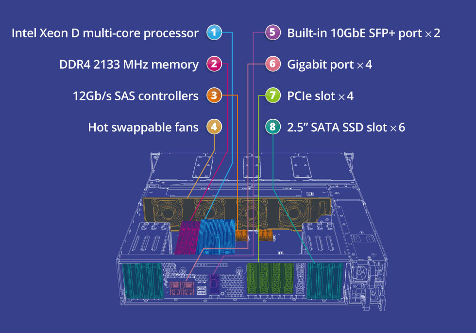 Накопитель TES-3085U, оснащенный 64-битным SoC процессором Intel Xeon D-1531 6-core 2,2 ГГц с интегрированной PCH платформой, поддерживает до 128 ГБ оперативной памяти DDR4 ECC RDIMM, имеет два встроенных порта 10 Гигабит SFP+ и 12 Гб/с SAS-контроллер. Линейка отличается превосходной производительностью в работе с данными, как в процессе передачи их по сети, так и в приложениях. Благодаря рассеиваемой мощности блока питания в диапазоне 20-65 Вт, накопитель, ко всем прочему, позволяет снизить затраты на электроэнергию.
