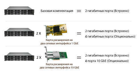 Пропускную способность штатных сетевых интерфейсов можно увеличить при помощи установки дополнительных сетевых карт 10 GbE или 1 GbE.
