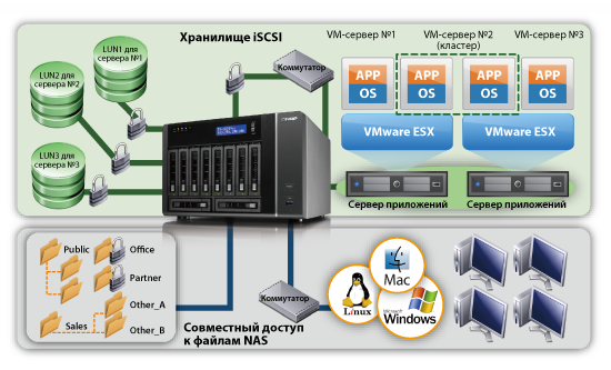 Серверы Turbo NAS бизнес-серии от QNAP полностью поддерживают такие технологии, как VMware, Citrix и кластеры Hyper-V Windows Server 2008.