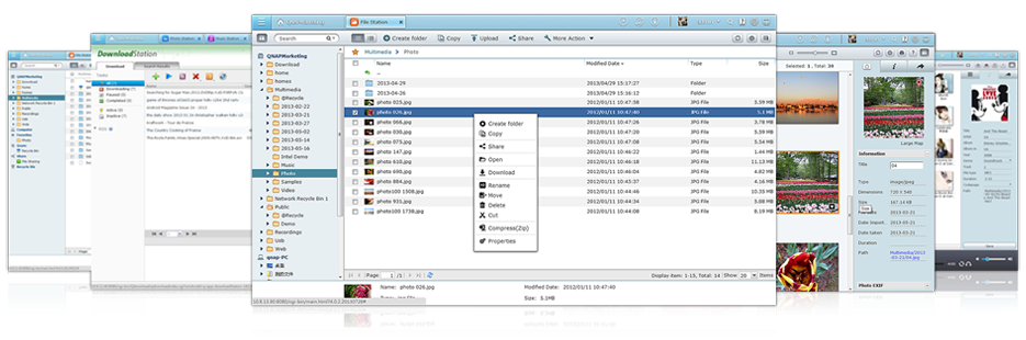 Рабочий стол QTS 4.0, включающий в себя основное меню, графическую панель мониторинга, пиктограммы с возможностью перетаскивания, несколько рабочих столов, персонализированные обои и «умную» панель инструментов, значительно облегчает выполнение системных операций. Поддержка мультизадачности позволяет одновременно держать открытыми несколько окон, работая параллельно с различными приложениями.