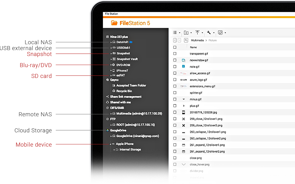 File Station — это базовое веб-приложение QTS для управления файлами с такими возможностями как: загрузка на NAS простым перетаскиванием мыши, перемещение между папками, переименование и удаление, настройка прав доступа для пользователей и легкий обмен ссылками. При помощи Microsoft Office Online вы можете открывать и изменять документы Word, Excel и PowerPoint, хранящиеся на TS-431X3, без необходимости скачивания с сетевого хранилища на ПК.