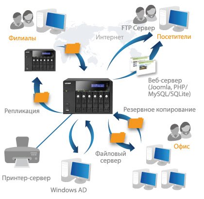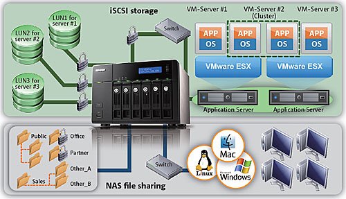 Сетевые хранилища QNAP могут одновременно служить в качестве NAS (Network-Attached Storage) для организации совместного доступа к файлам и быть частью облачных сред с использованием iSCSI.