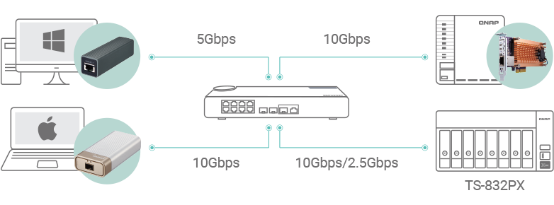 TS-832PX оснащен двумя сетевыми портами 2,5 Гбит/c RJ45, к которым подключаются существующие кабели CAT5e, при этом скорость сети повышается с 1 Гбит/с до 2,5 Гбит/с. Порты также поддерживают транкинг для повышения скорости передачи данных до 5 Гбит/с. С помощью адаптера QNAP N-BASET / Multi-Gig USB 3.2 Gen 1 - 5GbE (название модели QNA-UC5G1T) или карт расширения PCIe 5 GbE (название модели QXG-5G1T-111C) можно подключить ноутбук или настольный компьютер к сетям 2,5 Гбит/c совместно с TS-832PX. Так-же накопитель TS-832PX оснащен вдумя встроенными портами Gigabit Ethernet и двумя высокоскоростными сетевыми интерфейсами на 10 Гбит/с SFP+. Поддерживающая стандарт 10GbE, модель TS-832PX обеспечивает исключительно высокую пропускную способность. В сочетании с поддержкой высокой емкости хранилища накопитель TS-832PX идеально подходит для центров обработки данных благодаря умению работать с большими объемами данных и обеспечивать высочайшую скорость передачи данных, а также для редактирования видеофайлов большого размера "на лету", не пересылая их туда и обратно между накопителем TS-832PX  и настольными компьютерами.