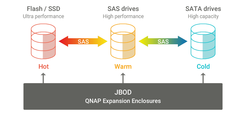 TS-873A поддерживает SSD-кэширование, которое повышает производительность для приложений требовательных к показателям IOPS, таких как виртуализация. А технология Qtier™ автоматически распределяет наиболее востребованные данных между 3,5-дюймовыми жесткими дисками большего объема и быстрыми SSD или модулями M.2 SSD. В Qtier™ 2.0 реализовано резервирование пространства на высокоскоростных SSD дисках, подобное кэш-памяти, для обработки пакетного ввода-вывода в реальном времени, что значительно увеличивает производительность системы.