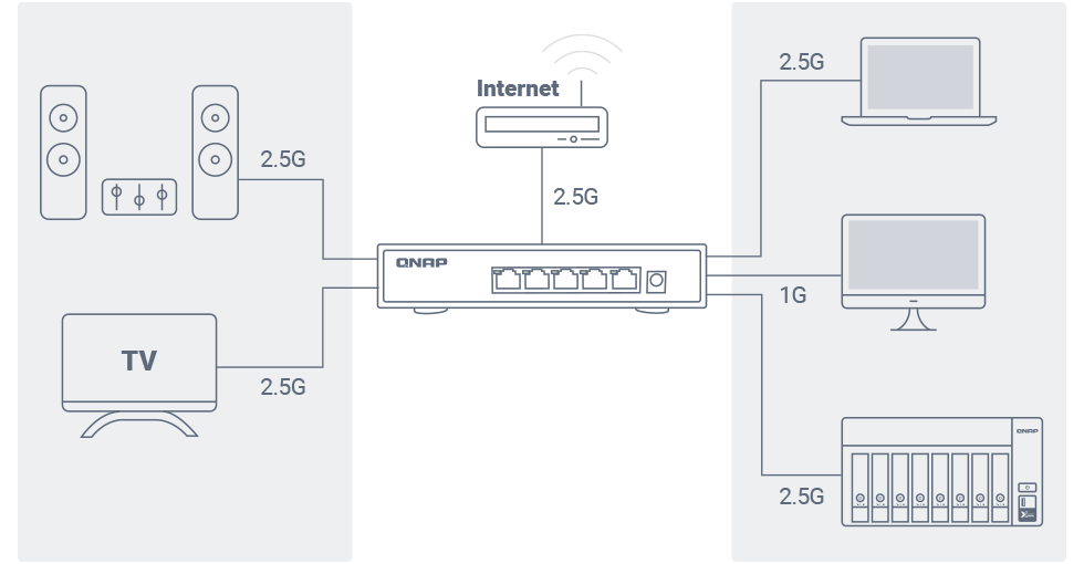 TS-873A оснащен двумя сетевыми портами 2,5 Гбит/c RJ45, к которым подключаются существующие кабели CAT5e, при этом скорость сети повышается с 1 Гбит/с до 2,5 Гбит/с. Порты также поддерживают транкинг для повышения скорости передачи данных до 5 Гбит/с. С помощью адаптера QNAP N-BASET / Multi-Gig USB 3.2 Gen 1 - 5 GbE или карт расширения PCIe 5 GbE можно подключить ноутбук или настольный компьютер к сетям 2,5 Гбит/c совместно с TS-873A.