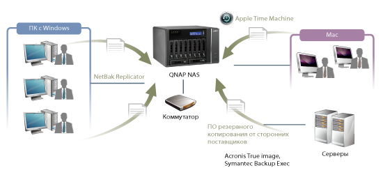 TS-879U-RP представляет собой решение для надежного резервирования и хранения информации. В системах под управлением ОС Windows репликацию данных можно производить при помощи приложения NetBak Replicator, так же, как Apple Time Machine служит для репликации данных в системах под управлением Mac OS. Часть компаний с уже сложившейся IT- инфраструктурой используют программные продукты сторонних производителей, в том числе Acronis True Image, Symantec Backup Exec и другие. Все эти программы так же поддерживаются платформой NAS от QNAP.