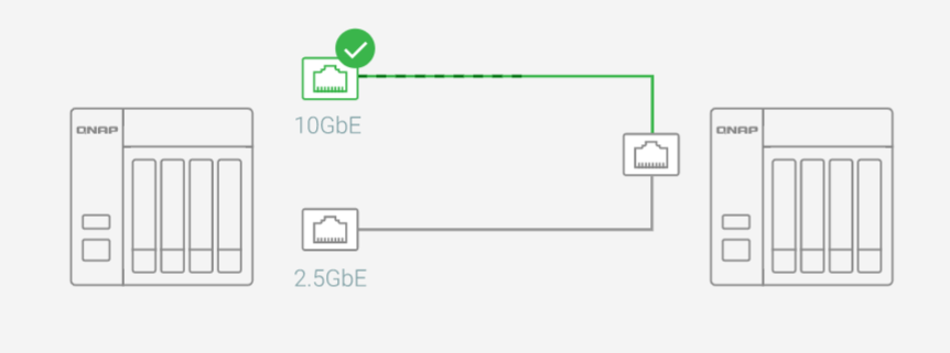NAS QNAP автоматически выбирает оптимальное физические сетевое соединение для вашей задачи, а также отрабатывает отказы для обеспечения непрерывного обслуживания и переключается обратно при повторном подключении более скоростной сетевой линии.