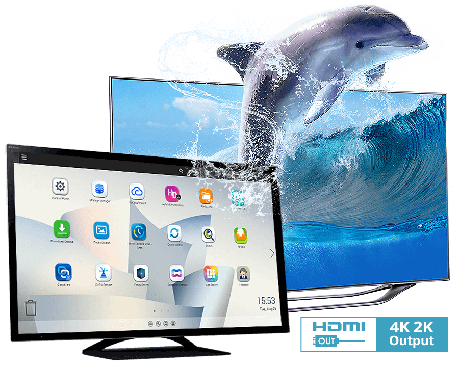Модель TVS-473e имеет на борту два 4K HDMI выхода и поддерживает режимы дублирования и расширения экранов. К устройству можно подключить телевизор, монитор или A/V-ресивер и с помощью сервиса HD Station просматривать видео, слушать музыку и онлайн-радиостанции, а также просто серфить в сети Интернет. Для управления приложениями HD Station устройство комплектуется инфракрасным пультом управления с функцией обучения, что позволяет легко запрограммировать часто используемые кнопки пульта телевизора и стерео системы. Обладатели Android и iOS смартфонов могут также осуществлять управление через мобильное приложение Qremote.