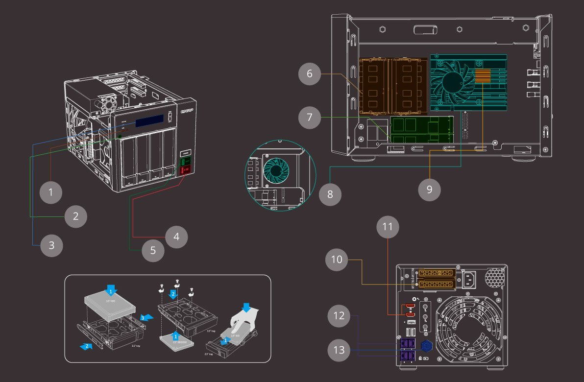 Для высокопроизводительного кэширования, а также автоматического распределения наиболее востребованных данных с помощью технологии Qiter хранилище может использовать 2,5-дюймовые SSD, а также модули M.2 SSD.