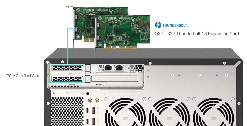 Установите карты расширения QXP-T32P (продаются отдельно) в слоты PCIe Gen 3 x4, чтобы подключить до четырех рабочих станций через интерфейс Thunderbolt™ 3 и повысить эффективность совместной с файлами, например для задач редактирования и просмотра 4K-видео.
