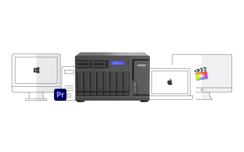 Пользователи рабочих станций с приложениями Final Cut Pro® и Adobe® Premiere Pro® могут централизованно хранить и совместно использовать медиафайлы на TVS-h1288X по протоколу SMB.
