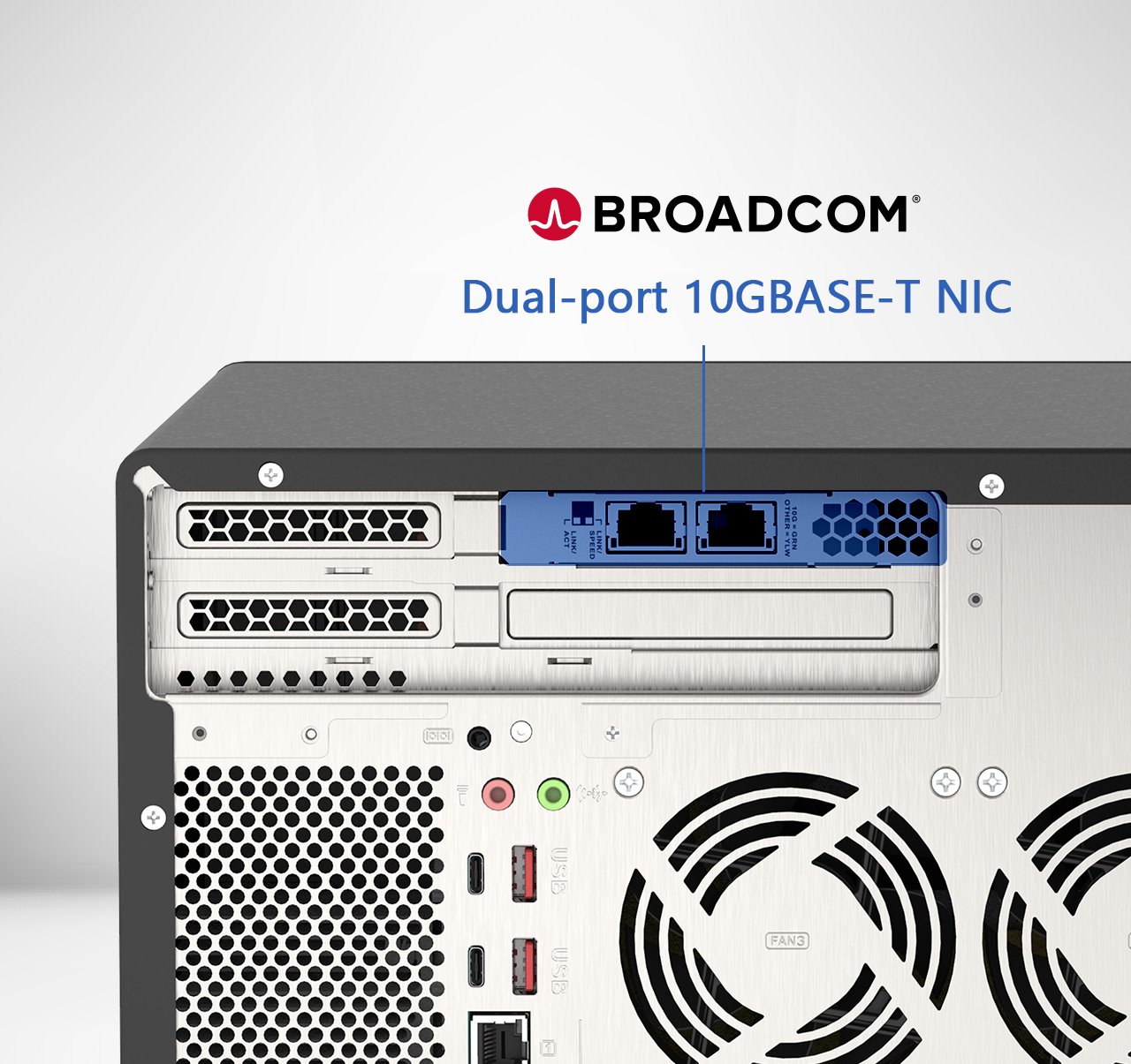 TVS-h1288X поставляется с предустановленной двухпортовой сетевой картой 10GBASE-T (10GbE/1GbE), поддерживающей аварийное переключение и пропускную способность до 20 Гбит/с при объединении портов. 10GbE SmartNIC построен на сетевом контроллере Broadcom NetXtreme® E-Series BCM57416, который поддерживает удаленный прямой доступ к памяти (RDMA) через конвергентный Ethernet (RoCE и RoCEv2), что позволяет данным обходить общие сетевые драйверы, уровень сокетов и напрямую поступать на сервер ESXi и в буфер памяти хранилища. Технология RoCE повышает производительность NAS, потому что снижает нагрузку на ЦП приложений, которые используют сетевые интерфейсы, что идеально подходит для передачи больших объемов данных с малой задержкой и высокой скоростью.