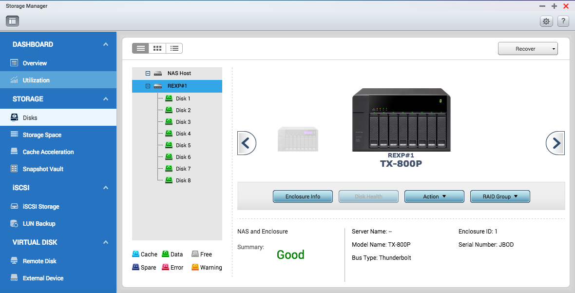 Менеджер хранения QTS предлагает все необходимые инструменты и возможности для управления системой хранения данных в виде удобного и понятного графического интерфейса пользователя, что значительно упрощает процесс расширения дисковой емкости сетевого накопителя и управления модулем TX-500P. Независимо от уровня подготовки, пользователь может легко контролировать состояние TX-500P и установленных в него дисков. В случае подключения сразу нескольких модулей расширения можно без труда идентифицировать каждый из них и соответствующие диски.