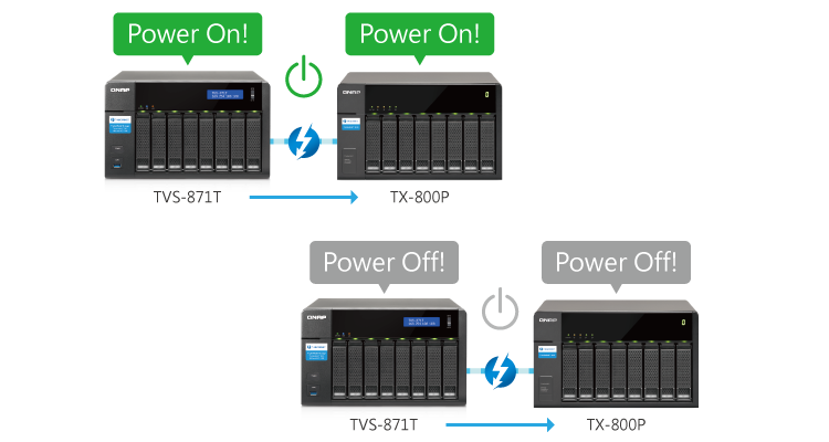 Модуль расширения TX-500P автоматически включается и выключается в зависимости от головного устройства – сетевого хранилища QNAP Turbo NAS, что позволяет экономить электроэнергию и повышает удобство работы.
