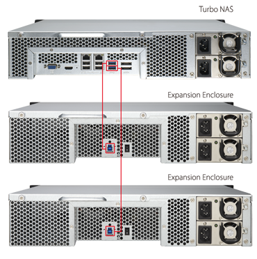 Просто подключите UX-1200U-RP к сетевому накопителю Turbo NAS и электропитанию. Система Turbo NAS автоматически распознает жесткие диски, установленные в модуле расширения, как новые внутренние. Все дальнейшие операции с ними, такие как объединение в RAID-массивы и логические тома, доступны в Менеджере хранения операционной системы QTS.