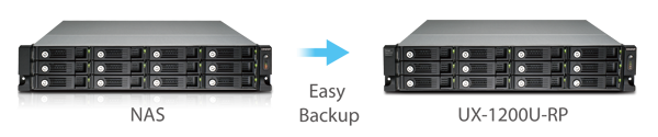 Модуль расширения QNAP UX-1200U-RP используется как недорогое и быстрое хранилище, куда можно скидывать резервные копии важных данных с головного устройства Turbo NAS. Администратор настраивает выполнение бэкапов данных в режиме реального времени или по расписанию.